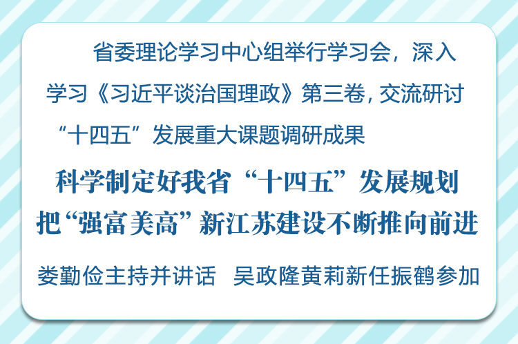 省委书记娄勤俭主持学习会并讲话,强调要以习近平新时代中国特色社会主义思想为指导,系统学习领会习近平总书记关于“十四五”发展的重要论述,科学制定好我省“十四五”发展规划,开创“强富美高”新江苏建设新局面,为全面开启社会主义现代化建设新征程开好局、起好步。省委副书记、省长吴政隆,省政协主席黄莉新,省委副书记任振鹤参加学习。