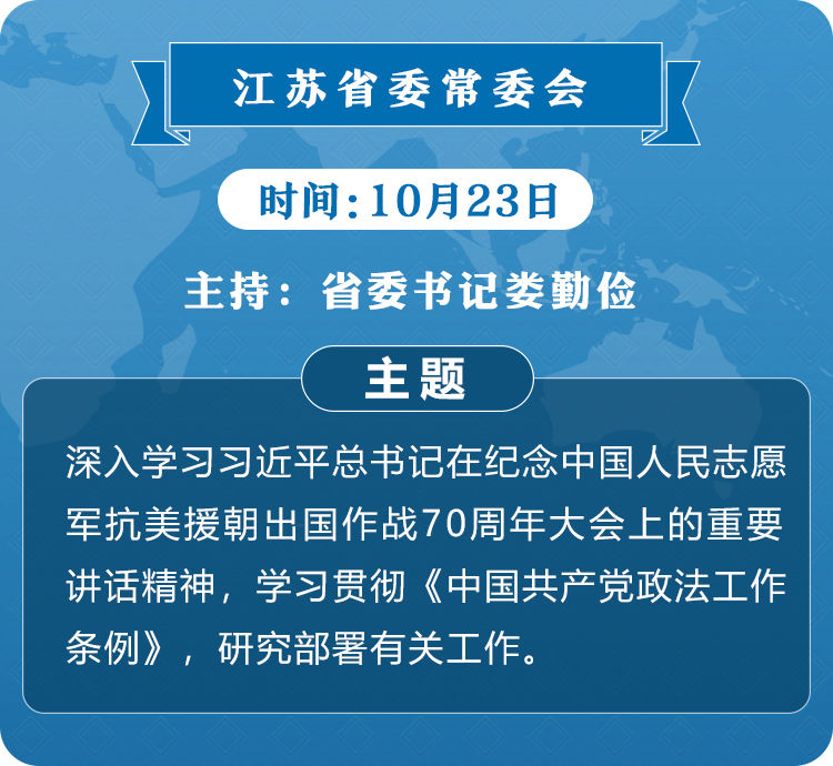 荔枝新闻讯 10月23日,省委常委会召开会议,深入学习习近平总书记在纪念中国人民志愿军抗美援朝出国作战70周年大会上的重要讲话精神,学习贯彻《中国共产党政法工作条例》,研究部署有关工作。