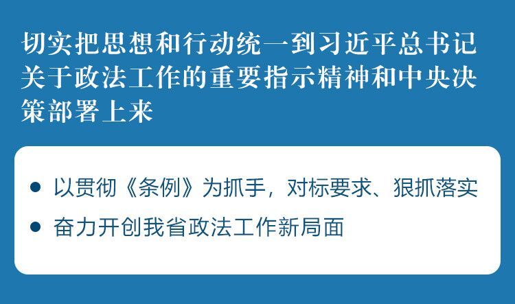 会议强调,《中国共产党政法工作条例》是做好新时代政法工作的根本遵循。要切实把思想和行动统一到习近平总书记关于政法工作的重要指示精神和中央决策部署上来, 以贯彻《条例》为抓手,对标要求、狠抓落实,奋力开创我省政法工作新局面,为推动高质量发展走在前列、加快建设“强富美高”新江苏提供坚强保证。