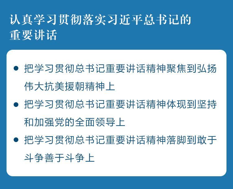 会议指出,习近平总书记的重要讲话,深切回顾了抗美援朝战争以弱胜强、气吞山河的光辉历史,深情缅怀了用生命捍卫和平正义的志愿军烈士,深刻阐释了抗美援朝精神的历史意义和时代价值,突出强调要铭记伟大胜利、推进伟大事业,不断书写中华民族伟大复兴的精彩华章。总书记重要讲话气势恢宏、内涵丰富、震撼人心,充分体现了中华民族不畏强暴、万众一心的爱国情怀,充分展示了中国人民反对霸权、珍爱和平的坚定决心,充分彰显了真理的力量、正义的力量、奋进的力量,为我们更好汲取历史经验、把握前进方向、推进事业发展提供了重要遵循,我们要认真学习贯彻落实。要把学习贯彻总书记重要讲话精神聚焦到弘扬伟大抗美援朝精神上,铭记光辉历史、激发强国之志,教育引导广大干部群众在新时代继续传承弘扬抗美援朝精神,将其转化为热爱祖国的坚定信念、不畏艰险的顽强意志、戮力同心的实际行动,凝聚建设“强富美高”新江苏的强大力量。要把学习贯彻总书记重要讲话精神体现到坚持和加强党的全面领导上,增强“四个意识”、坚定“四个自信”、做到“两个维护”,坚持党的绝对领导不动摇,坚持用新思想武装头脑不动摇,坚持以人民为中心不动摇,始终保持各项事业的正确方向。要把学习贯彻总书记重要讲话精神落脚到敢于斗争善于斗争上,锤炼斗争意志、坚定必胜信心,在推动高质量发展、坚定不移扩大开放、加强党的建设等方面敢于斗争,在攻坚克难中不断夺取新的伟大胜利。