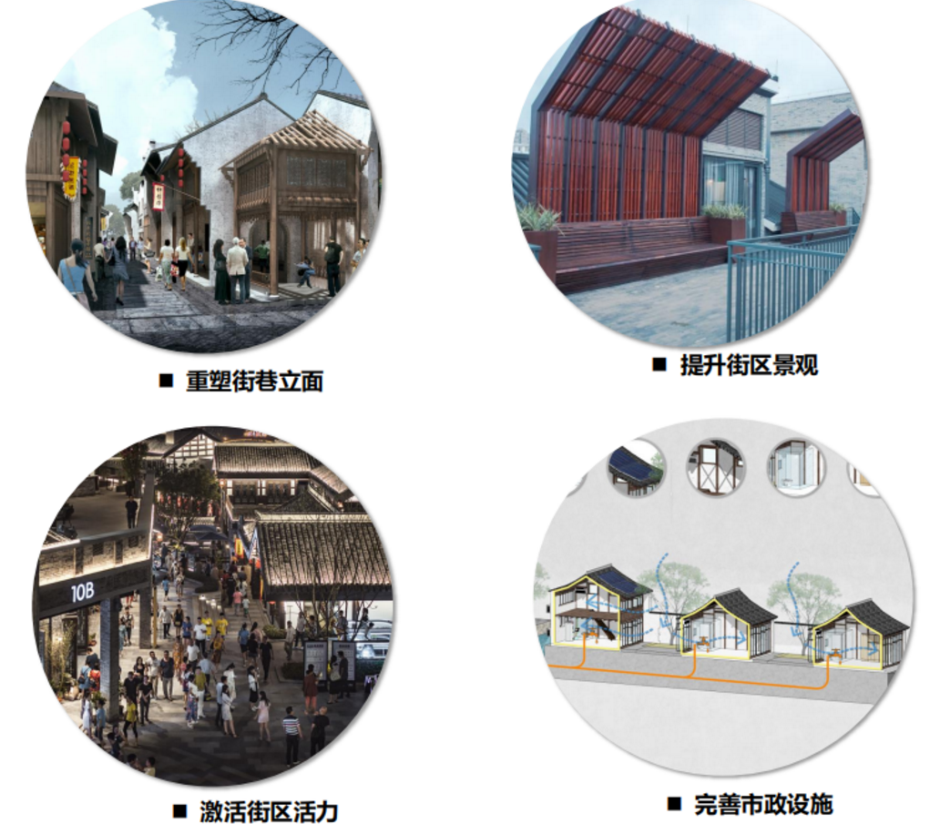 由于各时代的建筑并存,居住建筑和商业建筑相间,街道显得相对混杂,所以本次更新工程的重点为:改造沿街立面,统一形式特征。