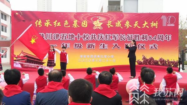 红军长征胜利84周年纪念日之际,昨天(10月22日),江苏淮安周恩来红军小学,来自苏湘陕川津五地十校的近千名一年级学生举行集体入队仪式。激励广大少年儿童继承革命传统,传承红色基因,弘扬伟大长征精神。