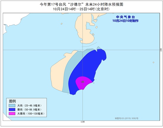 降水预报:24日14时至25日14时,海南岛大部有中到大雨,其中,海南东部和南部的部分地区有暴雨,局地大暴雨(100~130毫米)。