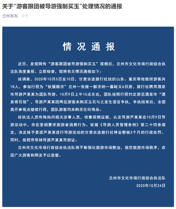 荔枝新闻讯 据 @兰州发布,近日,发现网传“游客跟团被导游强制买玉”视频后,兰州市文化市场行政综合执法队核查并通报了有关情况,详细通报如下: