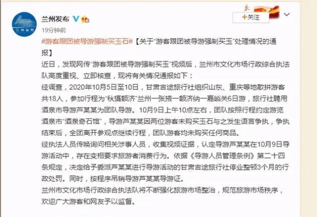 针对网友爆料导游强买强卖,据人民日报10月24日讯,兰州市文化市场行政综合执法队发布公告:吊销当事人导游证,涉事旅行社停业整顿