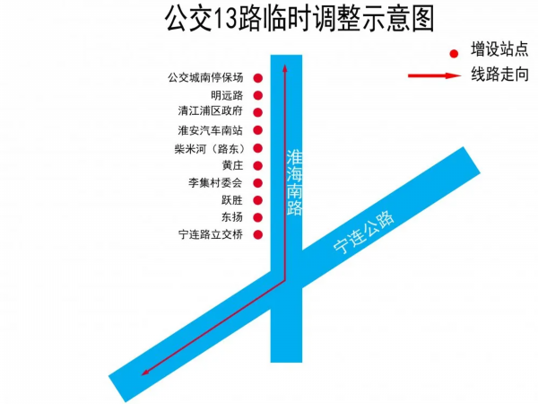 公交城南停保场、明远路、清江浦区政府、淮安汽车南站、柴米河(路东)、黄庄、李集村委会、跃胜、东扬、宁连路立交桥。