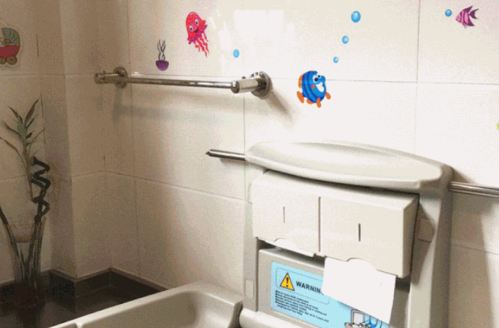 婴儿护理区配有两个带安全扣的专用婴儿护理台、废物箱。清洁区域干湿分离,出水龙头、洗手液、干手机全部采用非接触式设计,自动感应。