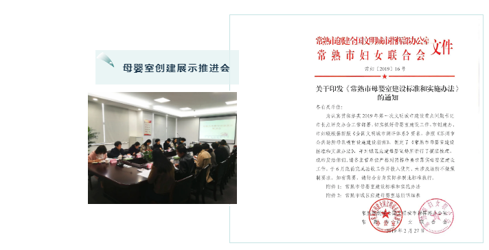 常熟市妇联、市文明办立足做实做优这一暖心工程、民心工程,制定《常熟市母婴室建设标准和实施办法》,对应配备母婴室的五大类场所、选址大小等设置标准作具体要求。这一工作也得到了相关职能部门、板块密切配合。