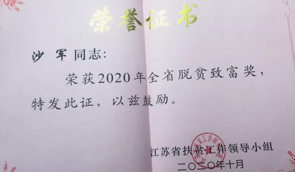 宿迁宿城区龙河镇沙军获得“脱贫致富奖”,是宿迁唯一获此殊荣的建档立卡低收入农户。