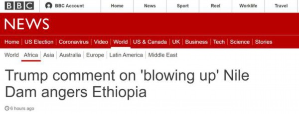 埃塞俄比亚总理随后誓言,埃塞俄比亚人会完成大坝的建设。“埃塞俄比亚不会屈服于任何形式的侵略,”他在一份声明中说,“埃塞俄比亚人从来不会屈服于他们的敌人,而是会尊重他们的朋友。我们今天和将来都不会这样做。” 在这个问题上的任何形式的威胁都是“(具有)误导性的、徒劳无益的以及明显违反国际法的”。BBC说,虽然艾哈迈德没有直接回应特朗普的言论,但促使他发表强硬言论的理由似乎毫无疑问(是因为特朗普)。
