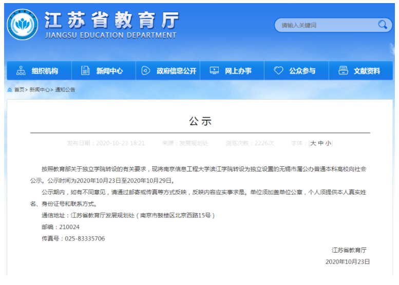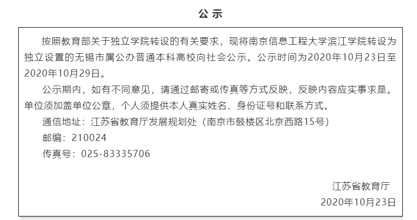 10月23日,江苏省教育厅发布公示,现将南京信息工程大学滨江学院转设为独立设置的无锡市属公办普通本科高校。