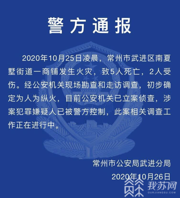2020年10月25日凌晨,常州市武进区南夏墅街道一商铺发生火灾,致5人死亡,2人受伤。经公安机关现场勘查和走访调查,初步确定为人为纵火。目前,公安机关已立案侦查,涉案犯罪嫌疑人已被警方控制,此案相关调查工作正在进行中。