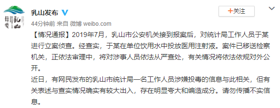 2019年7月,乳山市公安机关接到报案后,对统计局工作人员于某进行立案侦查。经查实,于某在单位饮用水中投放医用注射液。案件已移送检察机关,正依法审理中,将对涉事人员依法从严查处,有关情况将依法依规对外公开。