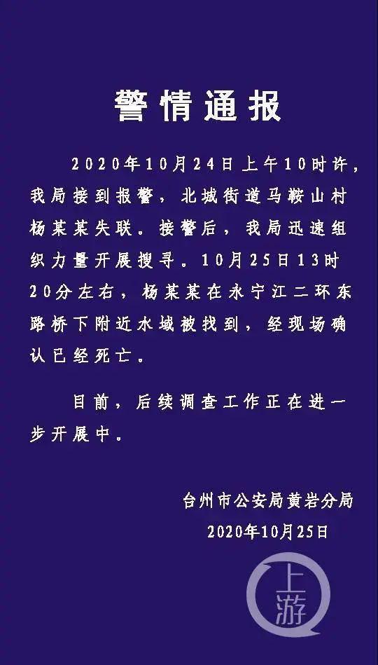 据台州市黄岩区委宣传部官方公众号“黄岩发布”消息,10 月 25 日晚,黄岩区公安分局发布警情通报,失联的北城街道马鞍山村杨某某于当天下午在永宁江二环东路桥下附近水域找到。现经公安机关勘验,杨某某系溺亡,排除他杀可能。