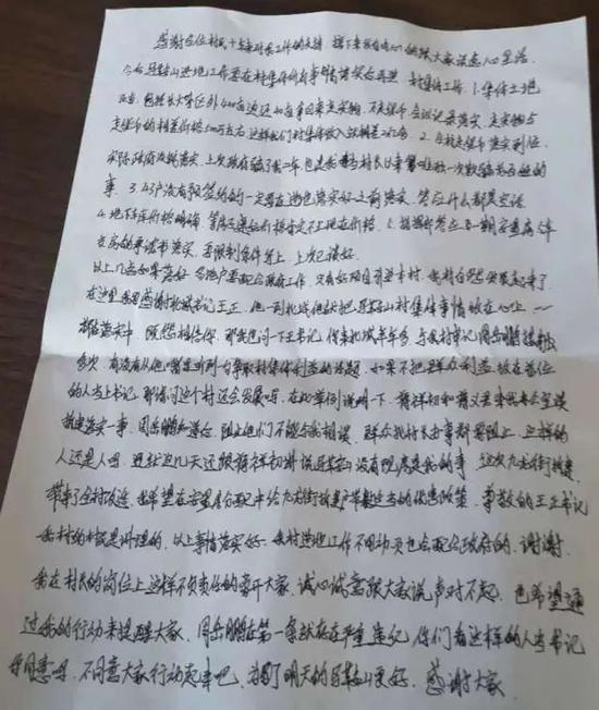 此前有媒体报道援引当地知情人士称,10 月 23 日晚,马鞍山村多户村民在自家院子里、门缝中,收到一封自称是村委会主任杨某某写的《致全体村民的公开信》。在这封《公开信》中,杨某某称村支记周某不仅把村集体土地私自给他人经营,还存在违规招标等情况。同时,在竞选村支书上,周某也采取过不光彩手段。