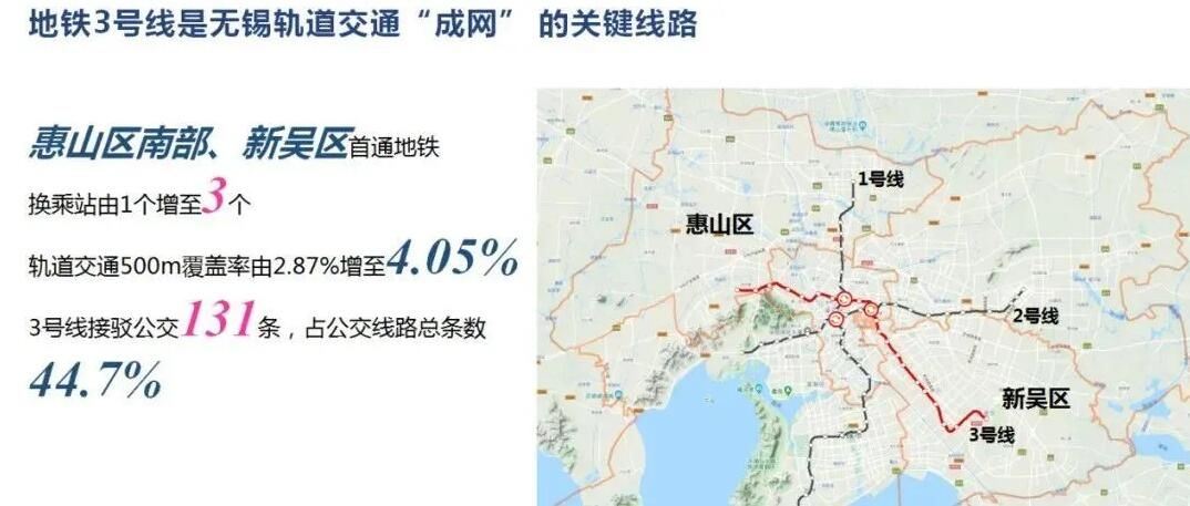 地铁1号线和2号线贯穿了无锡市区南北、东西两大主方向网,而无锡地铁3号线开通后,无锡由西北到东南的主干网也将正式打通,无锡市地铁三大主干方向网正式构成。届时,无锡新吴区片区和惠山区南部片区将享受到轨道交通带来的出行便利。