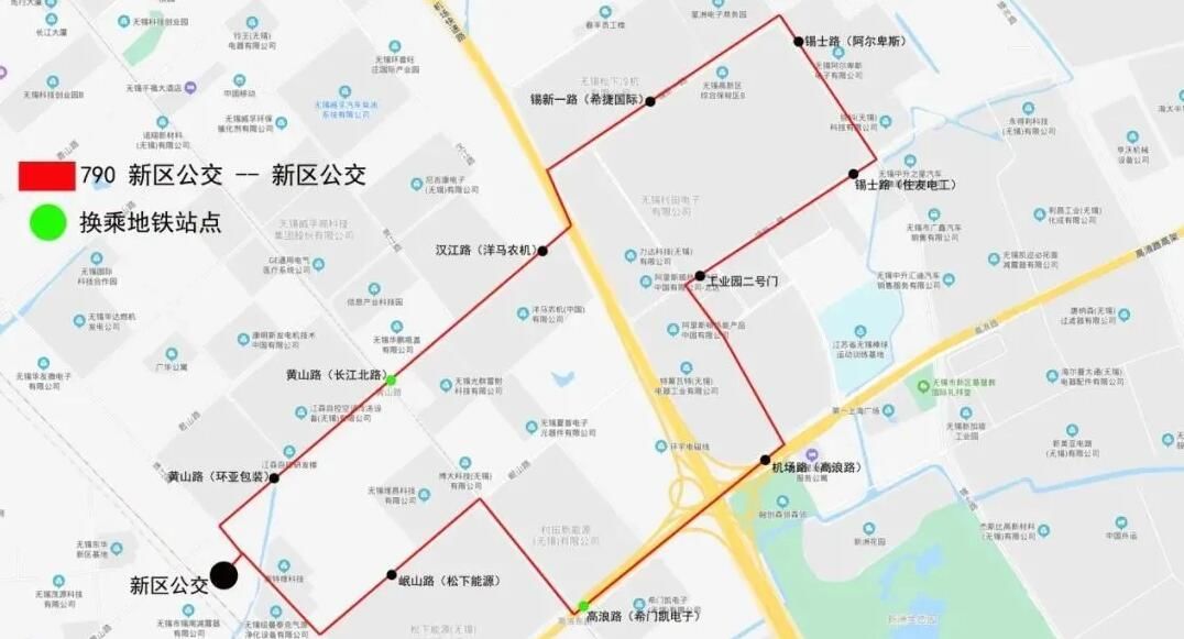 790路:新区公交—新区公交(由新区公交始发,经珠江路、黄山路、机场路、锡新一路、行创四路、锡新二路、长江路、岷山路、珠江路至新区公交)。