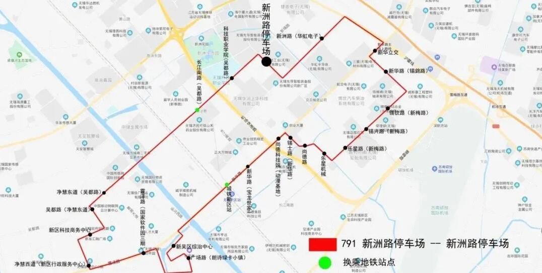 791路:新洲路停车场—新洲路停车场(由新洲路停车场始发,经吴都路、净慧东道、科研北路、净慧西道、震泽路、菱湖大道、清晏路、广场路、震泽路、新华路、锡士路、尚德路、新梅路、锡錦路、新华路、312国道、新洲路至新洲路停车场)。