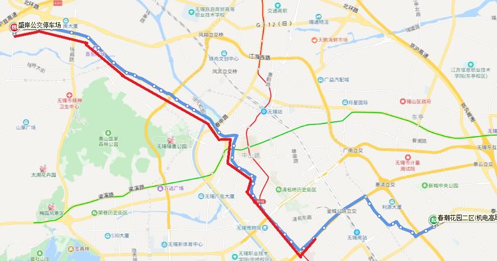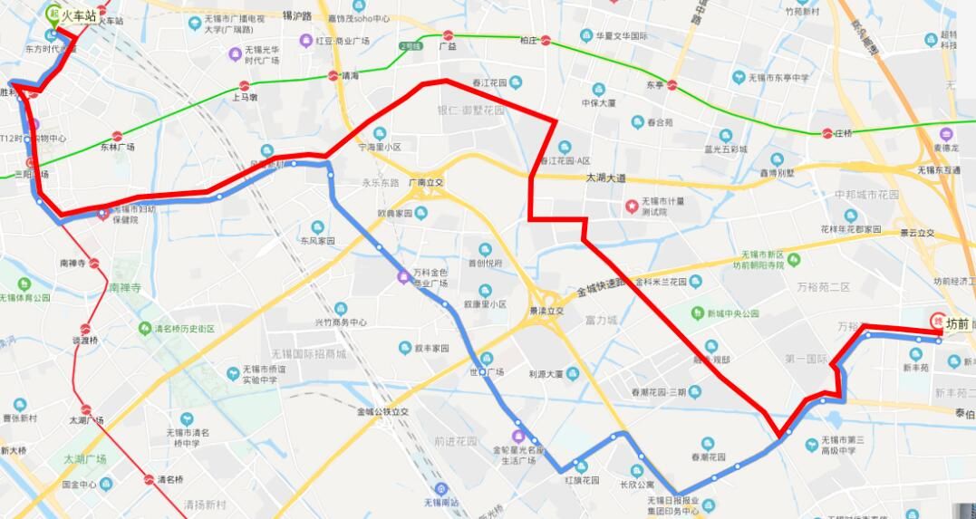 增设停靠:春潮三区、金城东路(锡士路)、春城家园、星月路(春新路)、太湖大道(华夏南路)、学前东路(华夏南路)、华夏南路(学前东路)、春江桥、崇安集贸市场(东方汽车二城)、尤渡苑、宁海里(学前东路)、江海新村。