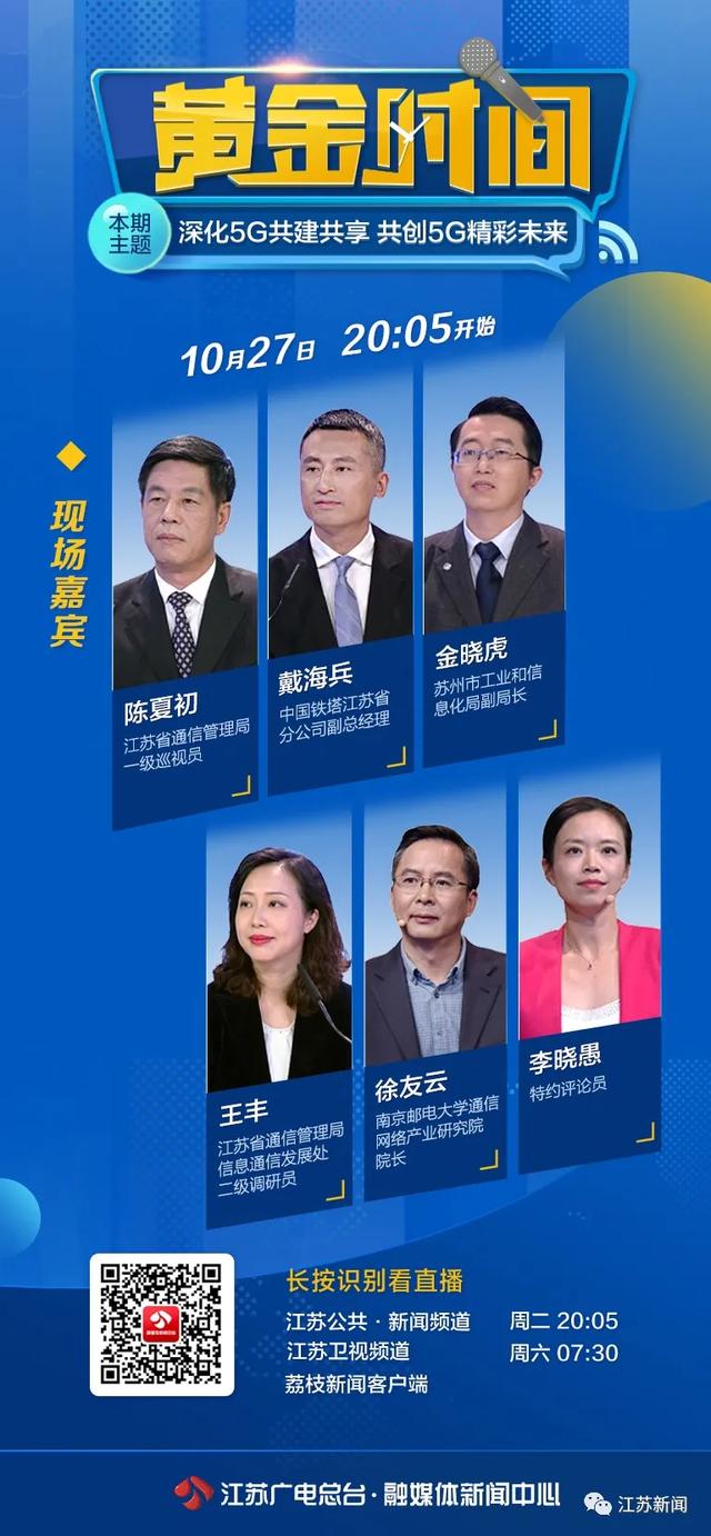 10月27日,江苏省委改革办与江苏广电总台融媒体新闻中心 江苏公共•新闻频道联合策划的大型改革政策解读节目《黄金时间—改革政策e解读》关注“深化5G共建共享 共创5G精彩未来”!