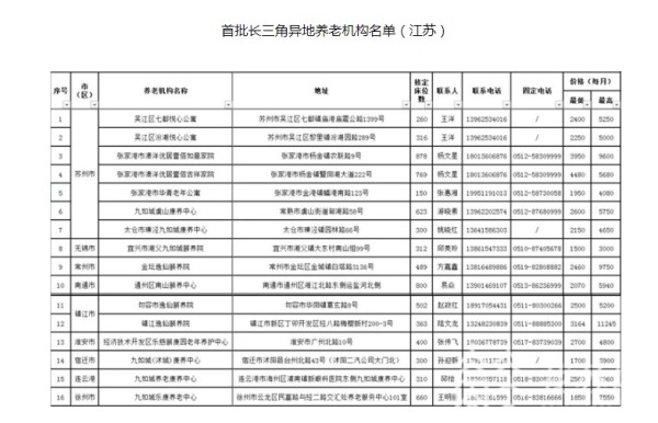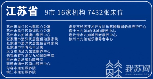 首批名单中,江苏省9市16家机构开放7432张床位:苏州市吴江区七都悦心公寓、汾湖悦心公寓,张家港市澳洋优居壹佰如意家院、澳洋优居壹佰吉祥家院、华青老年公寓、常熟市九如城虞山康养中心和太仓市璜泾九如城康养中心等养老机构入选。