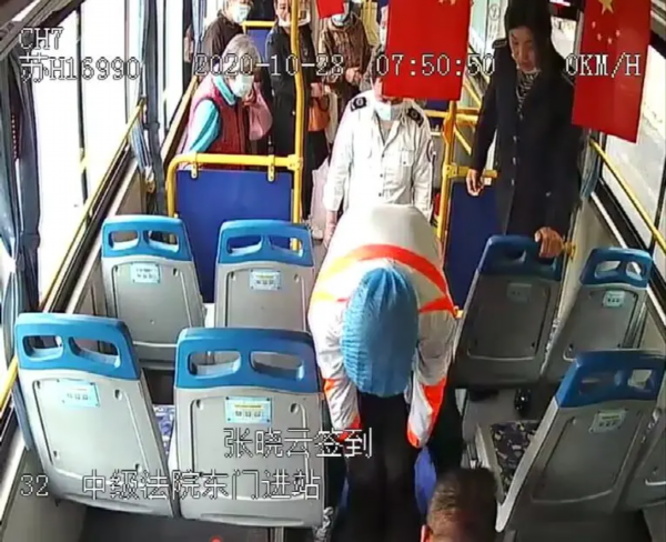 10月28日上午,淮安公交三分公司32路驾驶员张晓云师傅在营运过程中,忽然车内有乘客从后排来到驾驶室旁,焦急地对她说:“师傅啊,后面有人晕倒了!”张师傅听闻,立即将车安全的停靠在路边,然后匆忙来到车厢后方查看情况。
