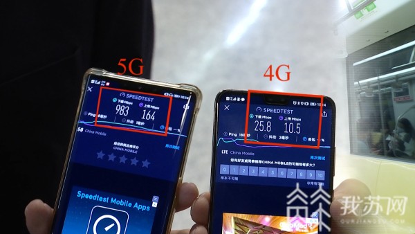 10月29日10:00,记者和两名测试人员实地测试。一名测试人员手持5G手机,另一名测试人员手持4G手机,通过专门的测速软件进行测速。在地铁10号线元通站站台上的测试结果显示,5G手机的下载速度是983Mbps,上传速度是164Mbps;而4G手机的下载速度是25.8Mbps,上载速度是10.5Mbps。测算下来,5G手机的下载速度是4G手机的38倍。