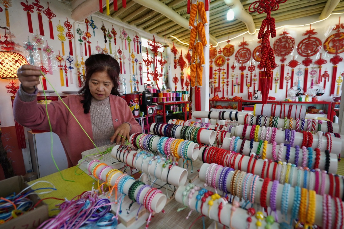 河北省秦皇岛市北戴河区北戴河村中国结艺术馆的工作人员在编中国结(10月28日摄)。新华社记者 杨世尧 摄