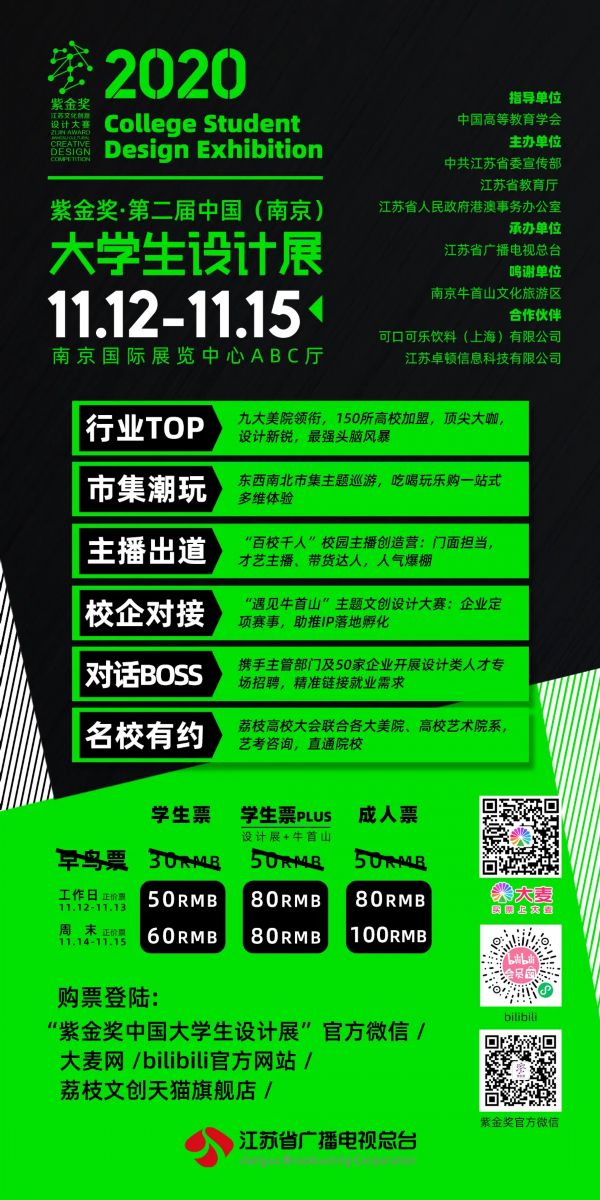现在关注“紫金奖中国大学生设计展”微信公众号在后台回复:我要票+所在城市即可参与幸运大抽奖!我们将从所有回复的留言中抽出幸运小锦鲤20名每人将获得大学生设计展门票2张!