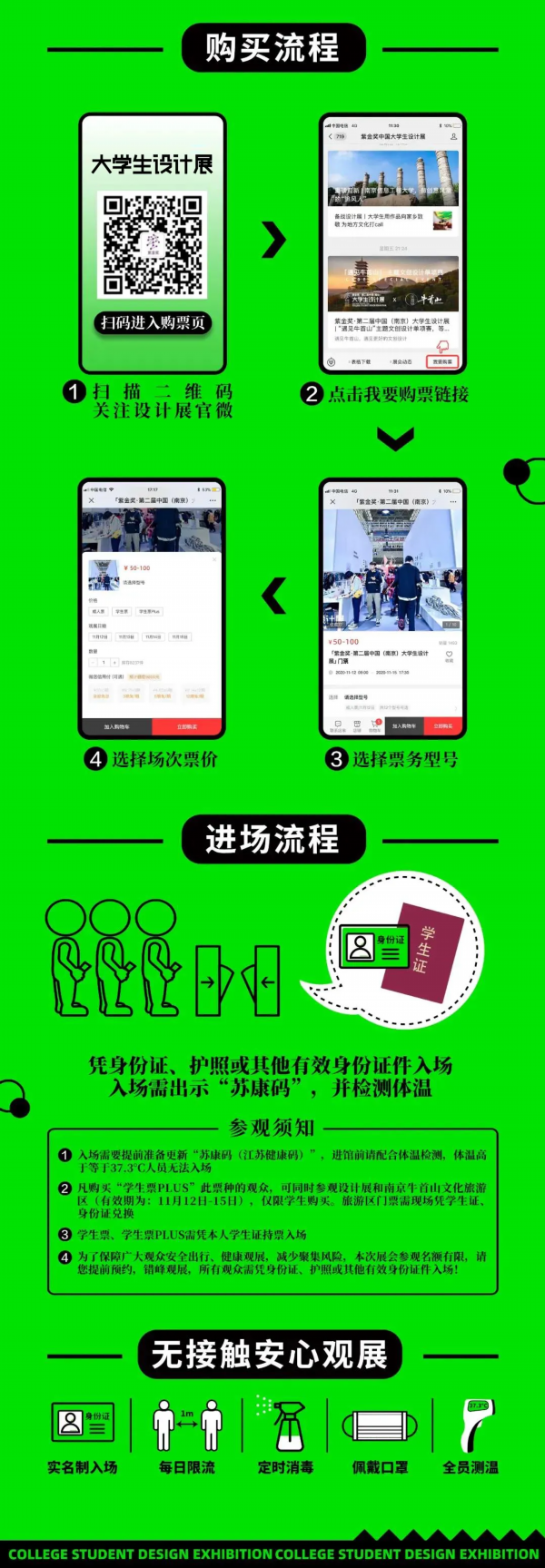 根据疫情防控需要,为避免观展人员大量排队造成的过度聚集,本届设计展分上午、下午两个场次入场,上午入场时间为:9:00—13:00,下午入场时间为:13:00—17:00,请在购买门票时,合理规划好出行时间,感谢理解与配合。