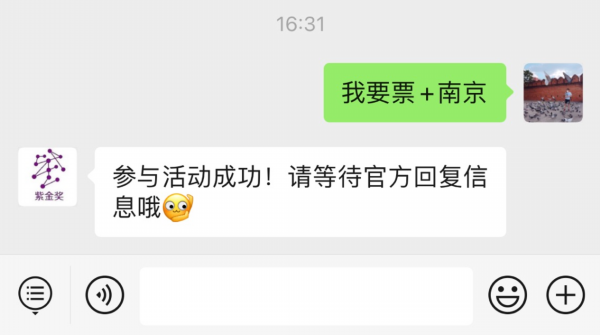 第二步:对话框回复“我要票+所在城市”参与(例如:我要票+南京)