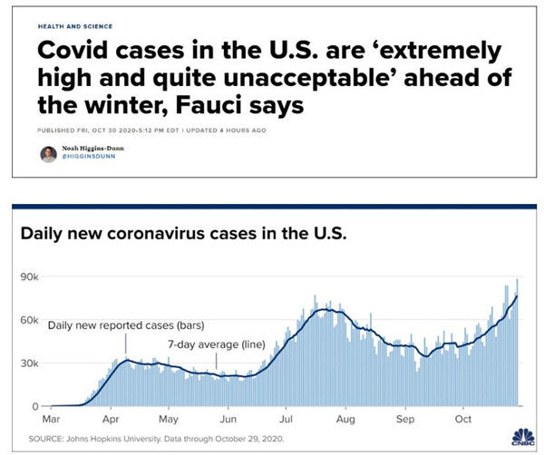 随着确诊病例迈入第三次高峰,多家美媒近日相继发出警告:美国已经进入疫情暴发以来“最严重的危险边缘”,而且在进入冬季后,第三波疫情将比前两波疫情的影响更为广泛。但对于“第三波”疫情的说法,美国顶级传染病学专家福奇并不认同。