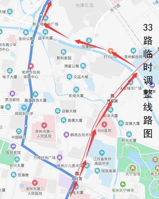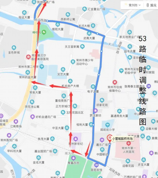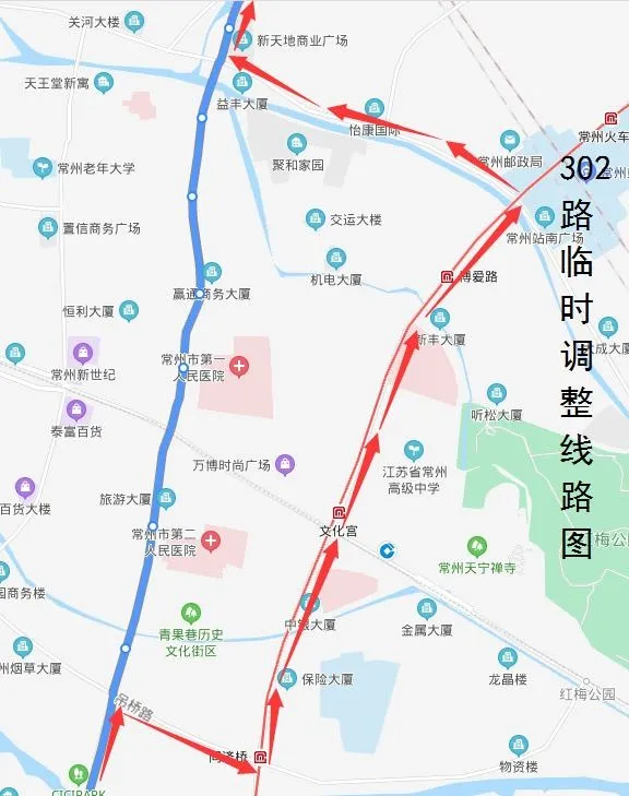 临时调整路段增设“和平路延陵路、904医院(明都大饭店)、新丰桥南、火车站西、怡康花园”单向停靠站。