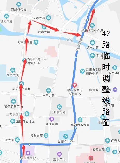 由清凉新村南返回时,按原线行驶至和平路、延陵路路口后,临时调整行驶和平路、关河路,至关河路、晋陵路路口后,再恢复原线行驶至新北公交中心站。