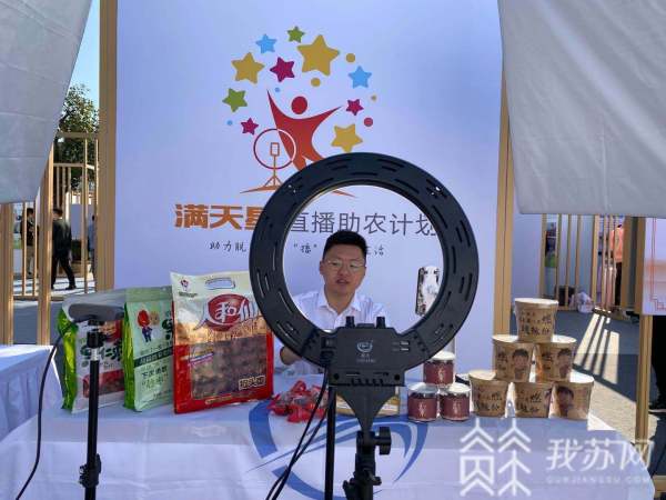 江苏省文明实践志愿服务项目展区,大学生志愿者主播,正在公益直播带货。