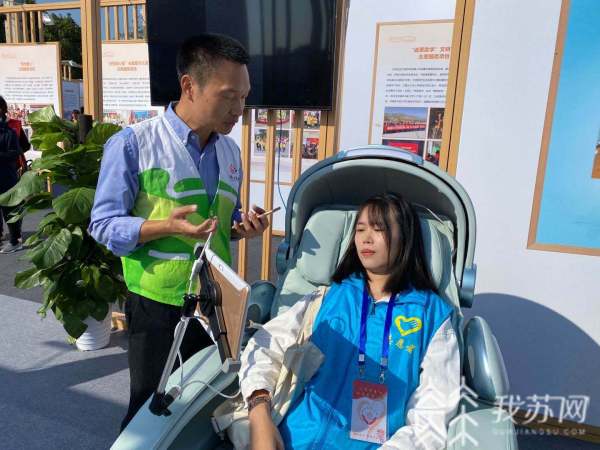 除了紧跟潮流的电商直播,志愿服务展区也有了科技产品的身影。去年,张家港市建成全省首家心理服务云平台,本届志交会展出的“身心减压太空舱”,就属于平台服务内容之一。进入“太空舱”,戴上设备,只需5分钟,市民就可以免费获取自身精神状况分析。
