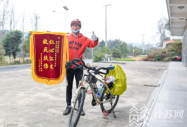 这位精神矍铄的老爷子名叫黄根本,5天前,他带着一面锦旗,踩上自行车从武汉出发,目的地:南京。