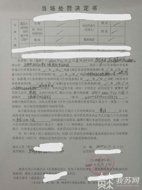 等到执法人员再次回头执法检查,发现当事人仍未整改,执法人员依据11月1日新实施的《南京生活垃圾管理条例》第二十七条第一款,开具当场处罚决定书,当事人当场被处罚 30 元。