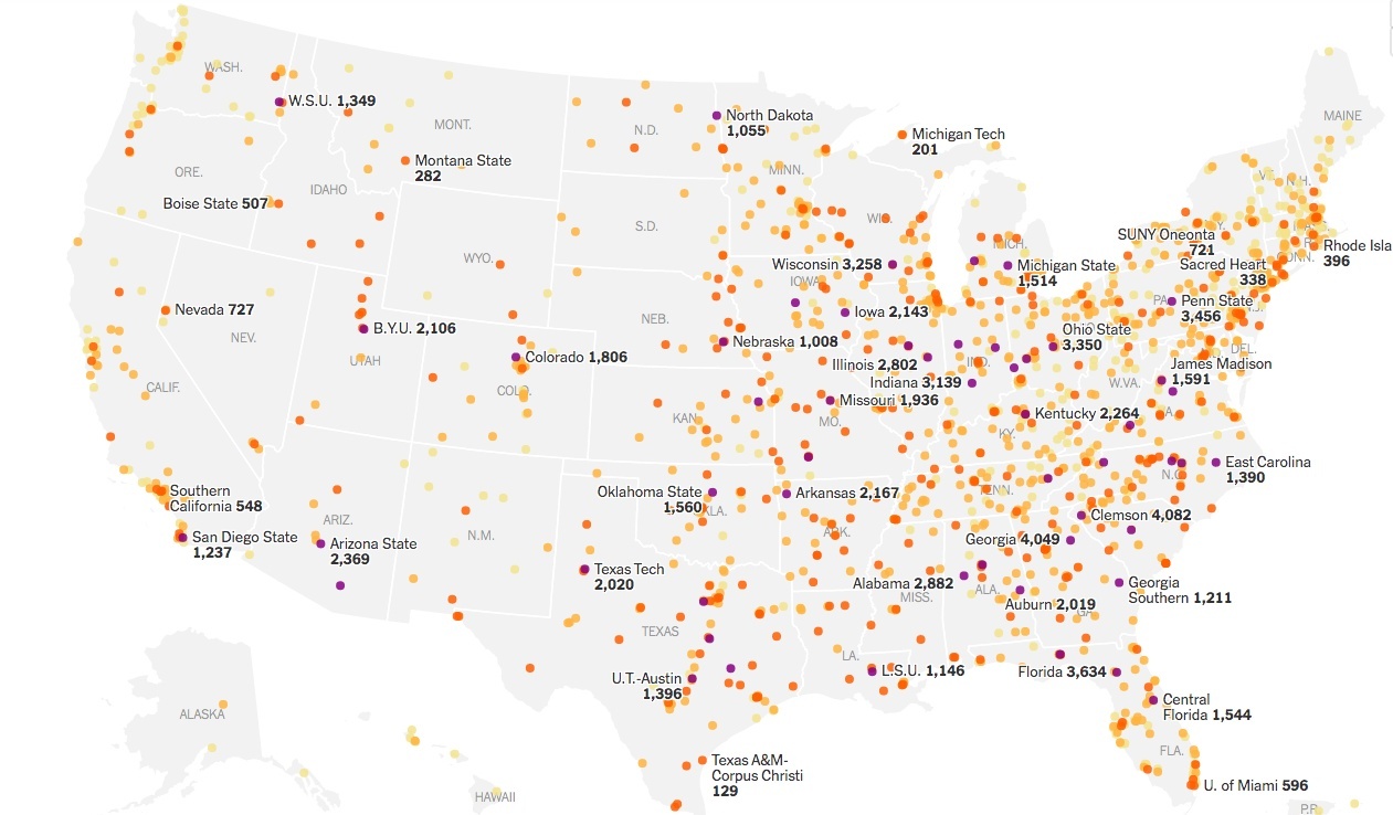 截止10月22日,美国各大院校新冠病毒感染数据 (图片来源:《纽约时报》)