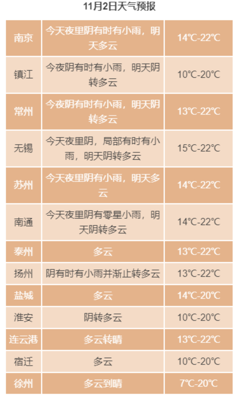 【未来三天江苏全省以晴好天气为主,早晨气温较低】今天苏南地区多云,其它地区多云到晴,今晨淮河以南部分地区有雾或浓雾,全省北到西北风3级左右,夜里逐渐增强至4-5级阵风6级,今天最高温度:沿淮和淮北地区19℃左右,其它地区20~21℃,明晨最低温度:淮北地区3~4℃,有霜或霜冻,江淮之间南部和苏南地区9~10℃,其它地区6~7℃。