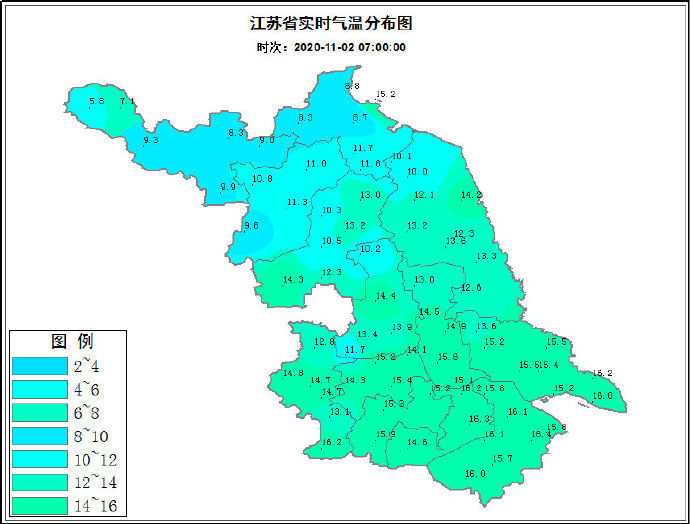早晨7点,江苏省北部地区气温相对较低,基本在8至11℃左右,南部地区的气温大多在13至15℃左右。今晨江苏淮河以南部分地区有雾或浓雾,提醒大家注意出行安全。