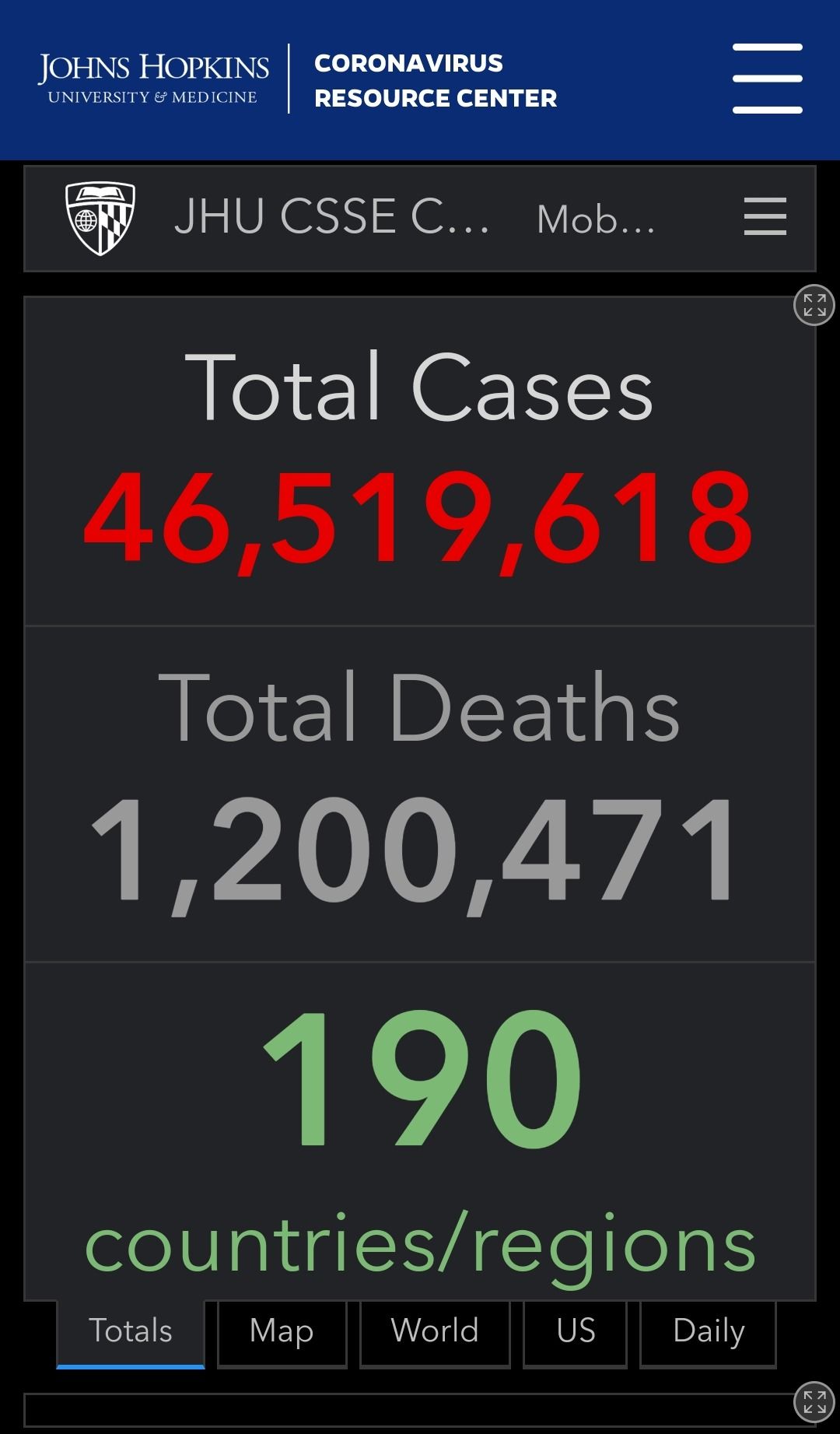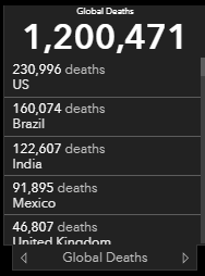 据美国约翰斯·霍普金斯大学实时统计,截至北京时间11月2日15时24分,全球因新冠肺炎死亡人数已经超过120万人。