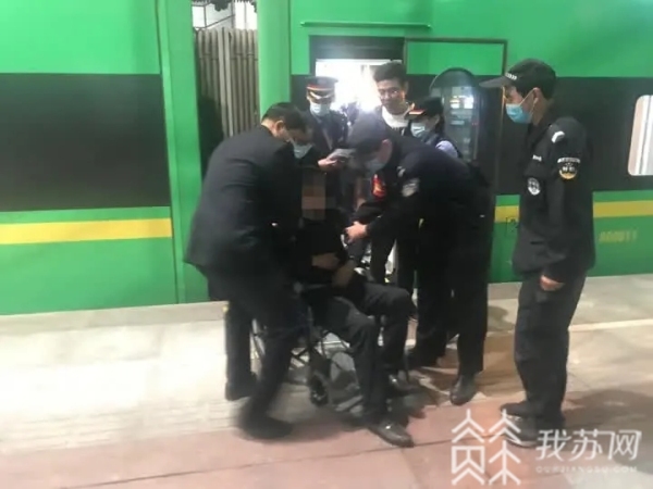 19时15分,列车准点到达扬州站,在民警、工作人员的共同帮助下,一名50岁左右的男性被搀扶下火车。只见他面色苍白,嘴唇不停的抖动,手捂着胸口,表情非常痛苦。大家小心翼翼地将他扶坐在轮椅上,立即往救护车即将到来的方向跑去。