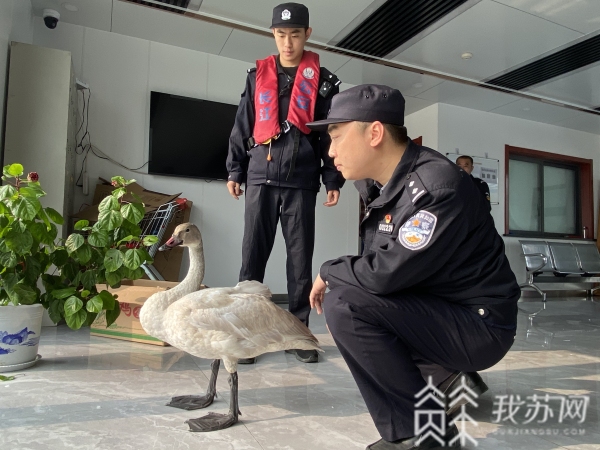 昨天(11月2日)上午,长江航运南京分局浦口派出所民警在进博会安保期间驾驶公安艇,对辖区水域开展日常巡逻,在长江南京水域143浮上水主航道上发现一只受伤的动物在水里挣扎。民警立即采取保护性措施将其带到浦口派出所警务趸船上,先联系南京江北新区农业执法部门工作人员后,确认其为国家二级保护动物小天鹅,然后民警和农业执法部门工作人员一起送至江苏省南京市野生动物收容所进行检查救治。