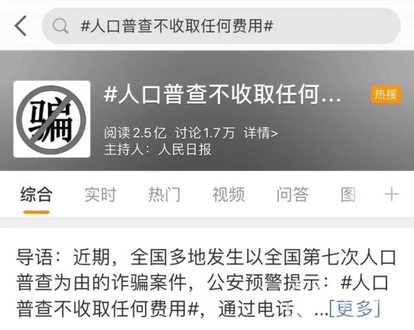 对于此前我国部分城市出现所谓普查员收取相关的费用,以及要求业主提供手机验证码等情况,警方表示,人口普查不收取任何费用,那么凡是通过电话、短信、网络社交工具等自称人口普查工作人员,以人口普查为由索取财物、财产、短信验证码以及账号密码信息的都是诈骗!