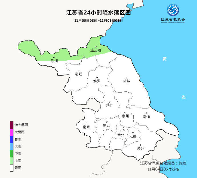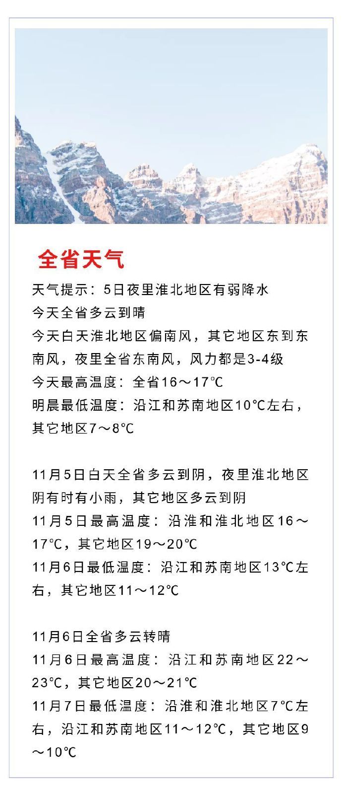 据江苏省气象台,今天(11月4日)全省多云到晴,今天白天淮北地区偏南风,其它地区东到东南风,夜里全省东南风,风力都是3-4级,今天最高温度:全省16~17℃,明晨最低温度:沿江和苏南地区10℃左右,其它地区7~8℃。