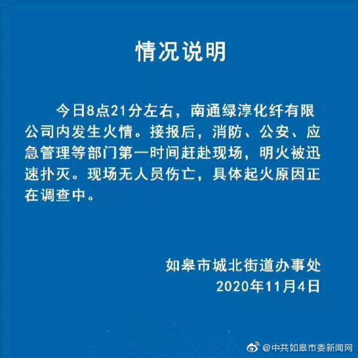 我苏网讯 今天上午南通如皋一化纤公司发生火情,中共如皋市委新闻网官方微博对此发布情况说明: