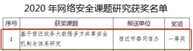 经过课题提交、PPT汇报、院校和省级机关相关部门专家打分、领导审定等环节,共评出一、二、三等奖和鼓励奖。宿迁市委网信办课题“基于宿迁政务大数据多方共享安全机制与体系研究”喜获一等奖!