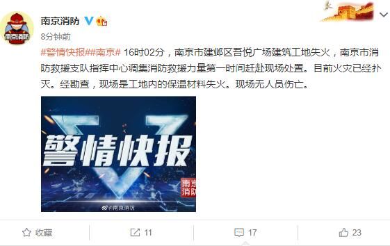 我苏网讯 今天下午,南京消防发布警情通报:16时02分,南京市建邺区吾悦广场建筑工地失火,南京市消防救援支队指挥中心调集消防救援力量第一时间赶赴现场处置。目前火灾已经扑灭。经勘查,现场是工地内的保温材料失火。现场无人员伤亡。