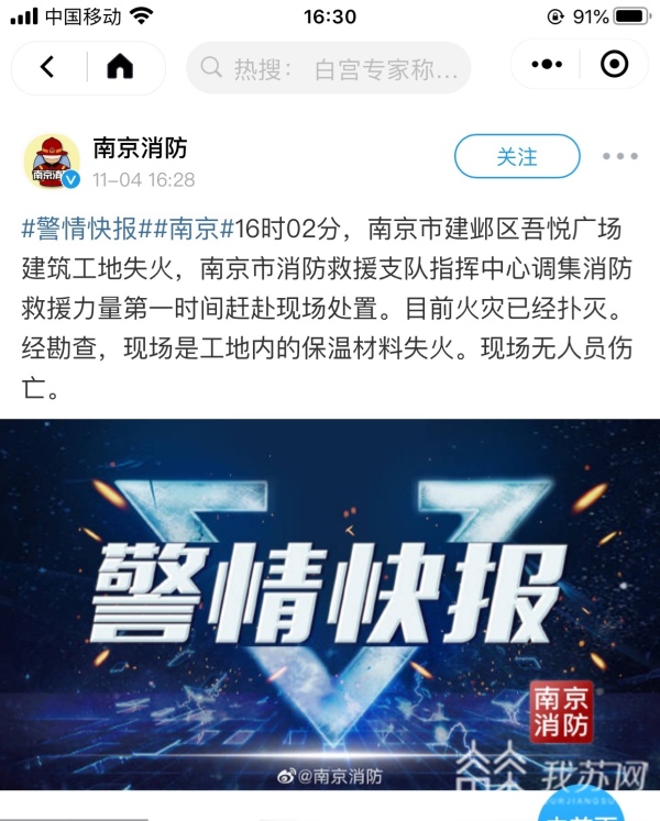 今天(11月4日)下午16时2分,南京市建邺区吾悦广场建筑工地失火,南京市消防救援支队指挥中心调集消防救援力量第一时间赶赴现场处置。